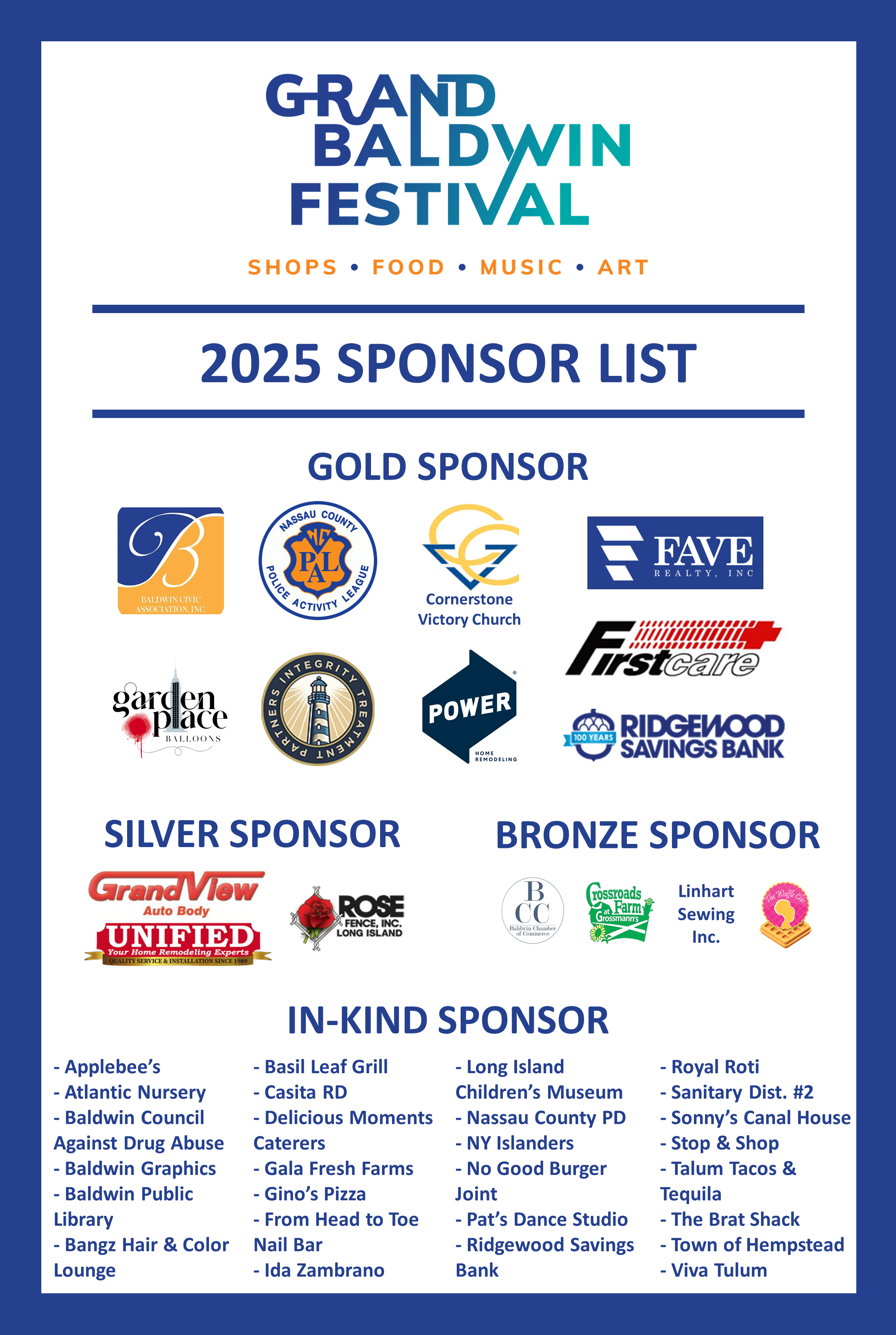 Sponsors are a critical part of making the Grand Baldwin Festival a successful event each year. Funding raised from sponsorships gets reinvested back into Baldwin by supporting community-building projects and events, as well as scholarships to Baldwin students that give back to the community. To become a sponsor of the 2025 Festival, please click the link below! A full list of 2024 Festival Sponsors is below for reference.